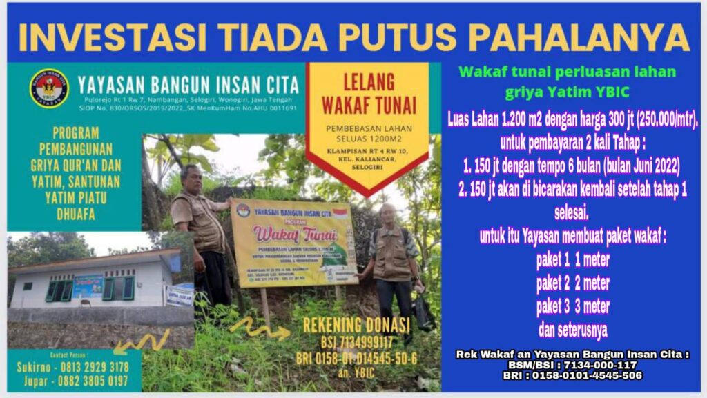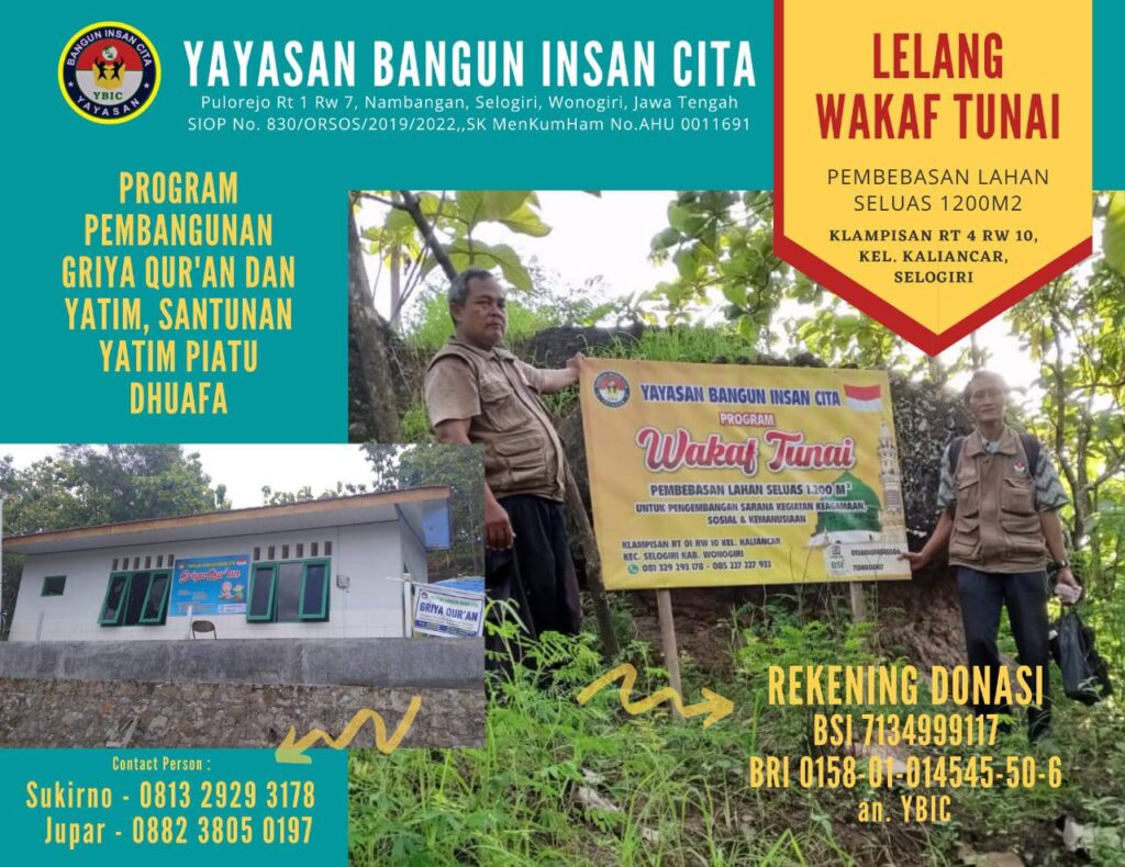 Dalam rangka memperkuat program pendidikan dan pembinaan anak yatim serta dhuafa, Yayasan Bangun Insan Cita (YBIC) membuka program Wakaf Tunai Perluasan Lahan Griya Yatim YBIC yang berlokasi di wilayah Selogiri, Wonogiri.